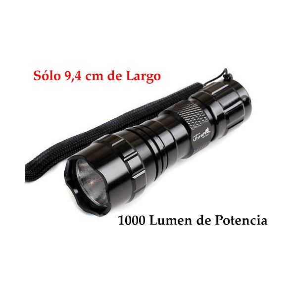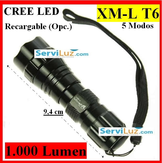 Linterna Led 1000 lúmenes de potencia con LED CREE XM-L T6 5 modos y solo 9,4 centimetros de longitud (Opcional: baterias recargables hasta de 2000 mAh + Cargador).Marca: UltraFire Material: Aluminio 6061TLED: Cree XM-L T6 Max 1.000 lúmenes5 modos: alta, media, baja luz estroboscópica, sosTamaño: 94mm (largo) x29mm (diámetro de la cabeza) x 20mm (diámetro del cuerpo)Voltaje: 3.6-4.2VBaterías: Lithium 1 x CR123A/RCR123A, 1 X Ultrafire 16.340 (no incluida) Color del cuerpo: Negro También está diseñada para montar en pistolas de mano de algunos rifles y escopetas con el equipo apropiado de montaje NOTA: Batería no incluida.Baterias recargables recomendadas: http://www.serviluz.com/baterias-recargable-y-cargadores-c-65/2-x-pilas-baterias-cr123a-123a-2000-mah-3-6v-multi-cargador-p-390